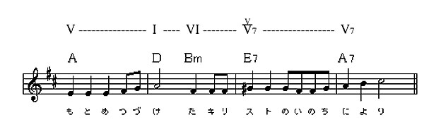 ヴァース部分はリフレイン部の最後の和音がトニック(主調の和音)に戻って落ちついているため(完結している)、トニックで始まることは最も野暮な方法でした。しかしサブドミナント(C-durで言えばF・A・C)で始まるのもポピュラーでも聖歌でもおさだまりのパターンなので、意外性のあるドミナント(C-durでいえばG・H・D)から始め、ドミナントで終わるというプランを立てました。そしたらアっという間に、流れ出るように出来てしまった。