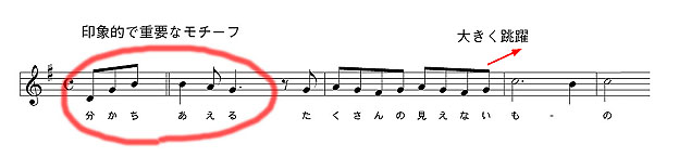 前半は、冒頭の「わかちあえる〜」をファンファーレ風に急激に駆け上がるフレーズで飾り、「沢山の見えないもの〜」では最後に大きな跳躍のある旋律にまとめました。この1節はいわば“つかみ”であるため、このように敢えて大きな盛り上がりをつけています。