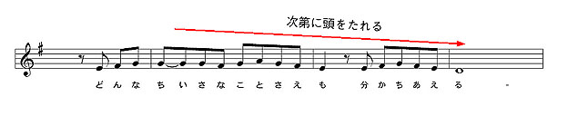 続く「どんな小さな事さえも分かち合える〜」の部分はゆったりと下降していく旋律線を用いました。ここは楽曲的には前の盛り上がりを一旦落ちつかせて次のフレーズに上手く移行させるためのブリッジではありますが、歌詞も「どんな小さなことさえも」という言葉を用いています。小さなことに目を向けるためには人はイメージとして下を向きますが、それは“小さなこと”は往々にして自分より小さい、という比較としての認識があるからです。故に、それを旋律線に乗せる事は(論理的に)効果的でもあると考えてのことです。