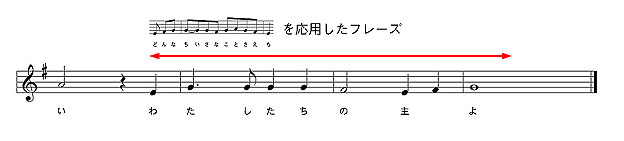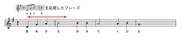 後半の「目を開かせて下さい、主よ」は、通常に音符を乗せていってしまえばそれで1節になってしまいますが、楽曲的にシマリがない3節構成(12小節で終わる曲は落ち着きがない)になってしまうのがイヤだったので、後半は主への願いであることから、ゆったりと歌い上げる、少々ナイーブな旋律を書くことにしました。それに従って「目を開かせて下さい」と「主よ」にフレーズを分割する事にしましたが、最後は“主よ”では言葉がまるっきり足りなかったため、私は「わたしたちの主よ」にしようと提案しました。そして「目を開かせて下さい〜」で冒頭の「わかちあえる〜」の旋律を模した歌い上げる旋律を用意し(C-Major7からB7というハーモニーでナイーブさを強調)、「わたしたちの主よ」で素直に着地させる、というようにまとめたワケです。形としては、8分音符が詰まった前半の旋律を、後半では2倍に引き延ばした上で模倣・変形するというものになっています。