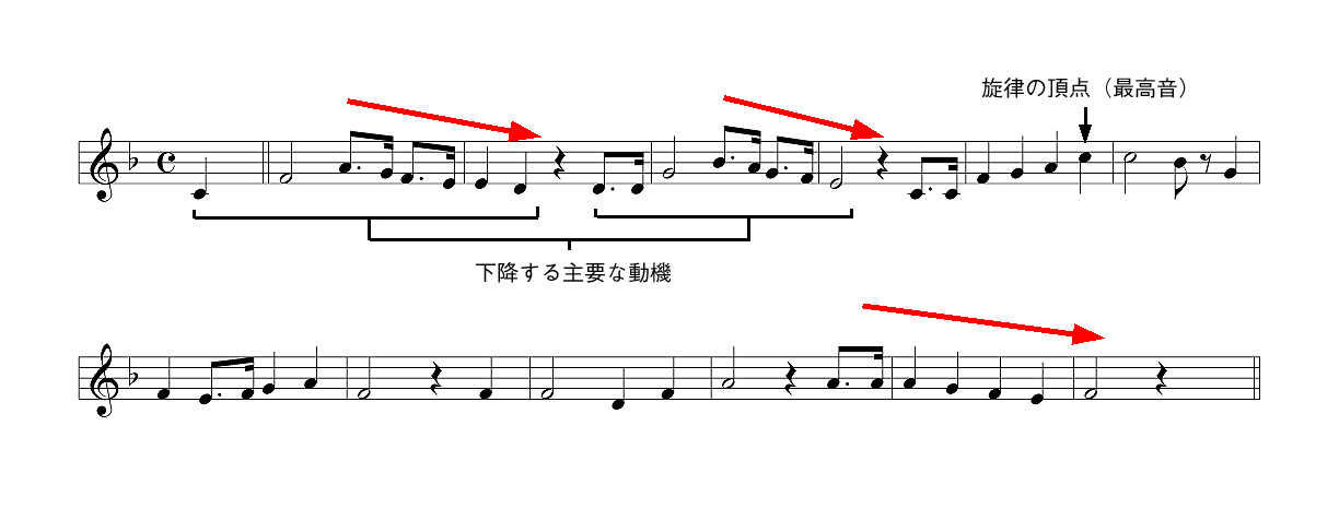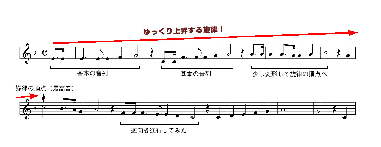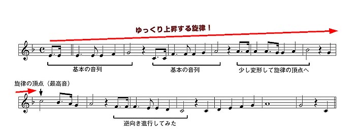 Aメロはサビと全く逆で、基本となるモチーフ(図では音列と記載。動機でもなんでもえーちゅぅの)を重ね合わせて、ゆったりと上昇して行きます。フレーズ同士にはキチンと間を持たせて、ゆったりしているのが特徴です。