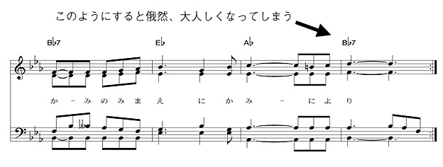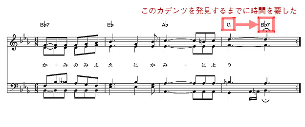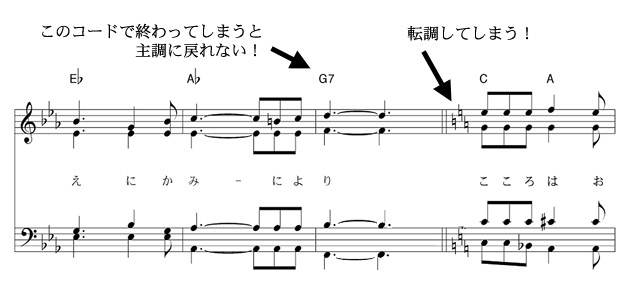 やはり上記の譜例のように普通に考えてはダメだ。Bbではなく、短三度下のGを使おう。するとこのカデンツは前の和音“Ab”から半音、ガクっと真下に落ちる劇的な展開になり、結果として壮絶な印象を与える大きなフックとなった・・・しかし、和声が次に求めてくるラインは主調のEbではなく(ここでのGからEbという、長三度下方への突然転調は和声学的には可能だが、旋律がそれを求めていない為、逆効果)、やはり短三度下のC、もしくはCm。一体どうやって歌の最初と最後が繋がるっていうんだ? これでは繰り返す度に転調して、最後は全員で悲鳴を・・・?! 動画にしましたので譜面と一緒にお聞きください。(譜面だけご覧になりたい場合はこちらをクリック)