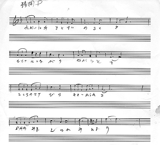 この歌は父が肺癌治療のために横浜の大学病院に入院して間もないころ・・・2003年2月頃にベッドの上で書いたものです。メモ用に使っていた五線紙ノートの1枚目には2種類の旋律(メロディーだけ)が記されていましたが、片方は途中までしか書いておらず、明らかに自分でボツにしたというのが判りました。2枚目の五線紙には、その旋律の最初の4小節だけに対し、四声体のハーモニーが記されていました。