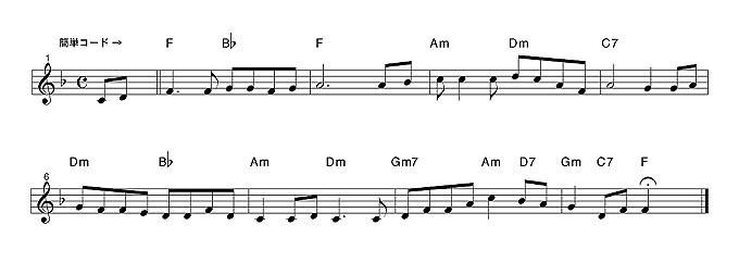 改訂を行っていた“聖歌改訂委員会”には3つの譜面を提出しました。1つ目は聖歌集掲載のもの、2つ目は少々ハーモニーを簡素化したもの、3つ目は「必殺!簡易ギターコード版」(下に記載)です。このギター・コード版はメロディー譜にコードが書いてあるだけのもので、思いっきり和音を省いてシンプルなものにしたのですが(下に表示)、演奏したらまるで別の曲でした・・・。つまり、この曲は和声によってある種の楽曲的性格(キャラクター)が与えられているということです。