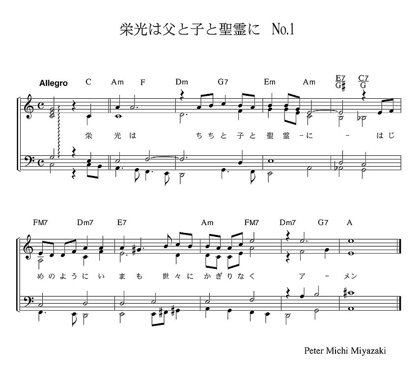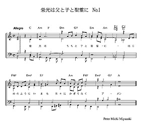 1つ目の [No.1] は華やかな感じで、大きく歌い上げる賛美に仕上がりました。しかしこれはボツ!(右に掲載しました譜面をクリックすると拡大したものを見ることが出来ます。下のリンクをクリックするとデモ音声を聞く事ができます)。