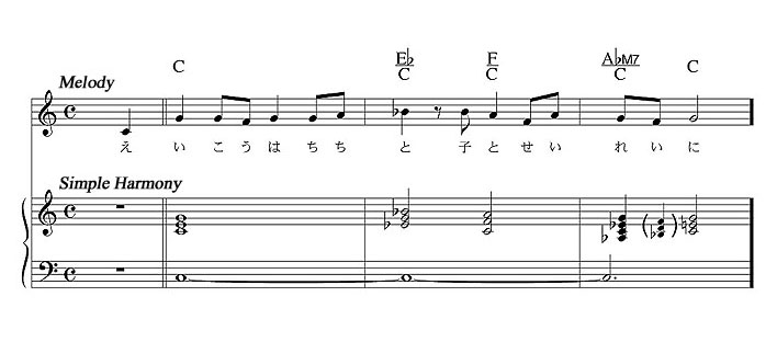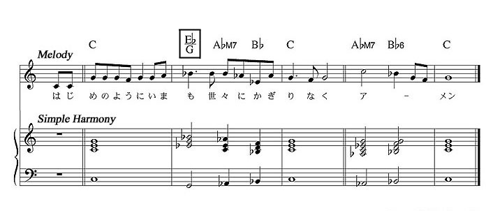 会衆が歌い出す4小節目からの「はじめのように今も・・・」と最後の「アーメン」は、コードで書くと C - Ab - Bb - C を基本とする同じカデンツを用いています。四角で囲ったEb/G(Es-G-Bの第一転回形)があるのは、司式者が歌う前段を受けてのレスポンスで旋律も同じため。全体からすると、コール&レスポンスが円滑に行われるように、そして会衆には会衆のアイデンティティーが示せるようにと、敢えて「アーメン」は同じコードで動く旋律を選び出したというワケです。