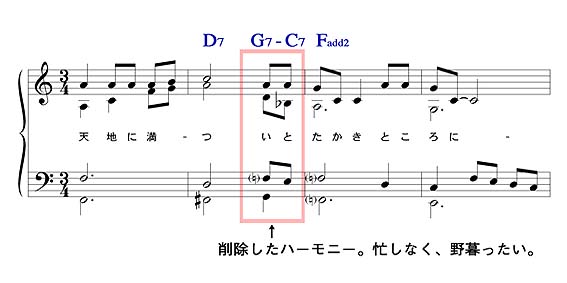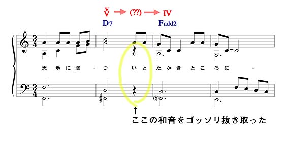 「聖なるかな」では、和声的には何とも理屈に合わない部分が11〜12小節間にあります。主調Cに対して副五度(ドッペルドミナント)であるD7から、サブドミナントのF(add2)に移行しています。壮絶な荒技です! 古典的な機能和声の理屈に合わないので、坂を登り詰めたところで空中に放り出され、浮遊して降下するような感触があると思います。