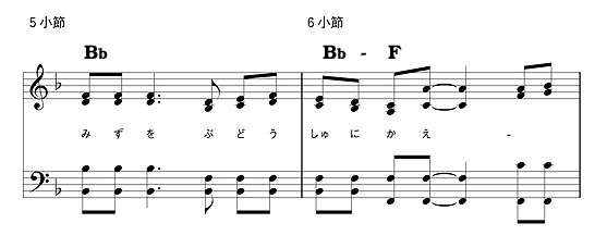 5小節目からサブドミナントのBbのコード(和声)になりますが、この和音が6小節目の1拍目いっぱいまで保続されています。詞を考慮に入れず、曲だけで考えた場合、6小節目は1拍目からトニックのFに戻った方が良いと、普通は考えます。