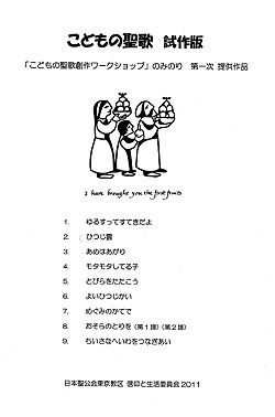 私は第2回目の会合の際に“講師”という形で参加、植松頌さんが作詞された「ゆるすってすてきだよ」と「小さな平和を結び合い」を元にサンプル7曲を作曲、その上で作曲者の立場から“詞”に対するアドバイスなぞを致しました。結果としてワークショップで作られた9編、全12曲(1つの詞に複数の曲が付けられたものがあるため)が2012年1月に冊子「こどもの聖歌・試作版」として無料配布されることになりましたが、そのうちの4つの詞に作曲させてもらいました(これらが即、今後まとめられて出版されるかもしれない「こども聖歌集」に載るとは限りません)。