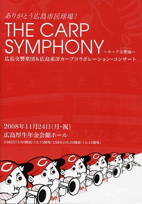 初演の舞台となった「ありがとう広島市民球場 - THE CARP SYMPHONY」は同年11月24日、2回公演で開催されました。前半はシンガーソングライター原田真二さんが藤野浩一さんの編曲・指揮による広島交響楽団をバックに従えてのステージ、後半が「カープ・シンフォニー」、最後は広島東洋カープ全国私設応援団・新藤邦憲会長はじめ応援団の方々が登壇、会場総立ちで「それゆけカープ」を大合唱。当日は雨の降りしきる寒い中、沢山のお客様が聞いて下さいました。2公演とも聞いて下さった方もいらっしゃいて嬉しかったものです。演奏を聞いた藤野浩一さんは、「誰が何と言おうと、これは君の、お父さんへのレクィエムだ」と評しました。