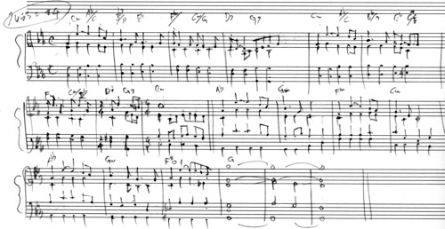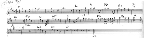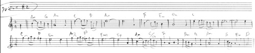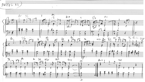 幸い「#1:静寂のアンビエント」は曲のアタマ(注:上記のメモ譜では最後に書いている)の「Aマイナー7th」のコードの4つの構成音がモチーフ(動機)だった。私はこれを“緑のモチーフ”と個人的に呼んでいた。そのモチーフから発想し、展開したのがメロディー(主旋律)となっている。そこで勝手に、映画全体に散りばめる主題的モチーフを「7thコード」という、至極シンプルなモノに決めた。この時点で、それが上手くいくかどうかはサッパリだったが、飽くまで個人的な感触として正しかった。