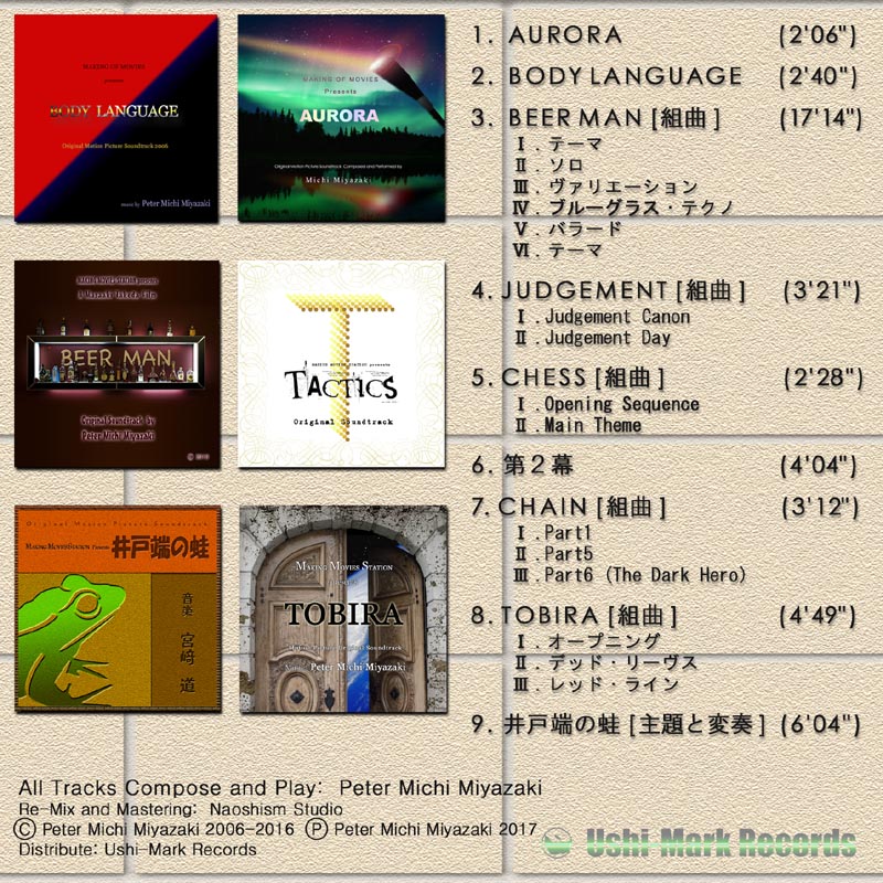 2010年完成の『BEER MAN』は、深夜枠のTVドラマにピッタリのコンテンツ。大人数のギャグ・コントを一本の映画にした感じで、音楽は映画の場面場面にピタッと寄り添う“映画音楽”ではなく、少々他人のような距離感の“TV深夜枠”風にしたかったので、ラッシュ(未編集の本編)を少し見せて頂き、使用場面を想定しないまま、この6曲から成る17分間の「BEER MAN組曲」を作りました。武田監督はこの組曲を聞いて、音楽が必要なシーンに、気に入った部分を切り出して使ったという次第です。